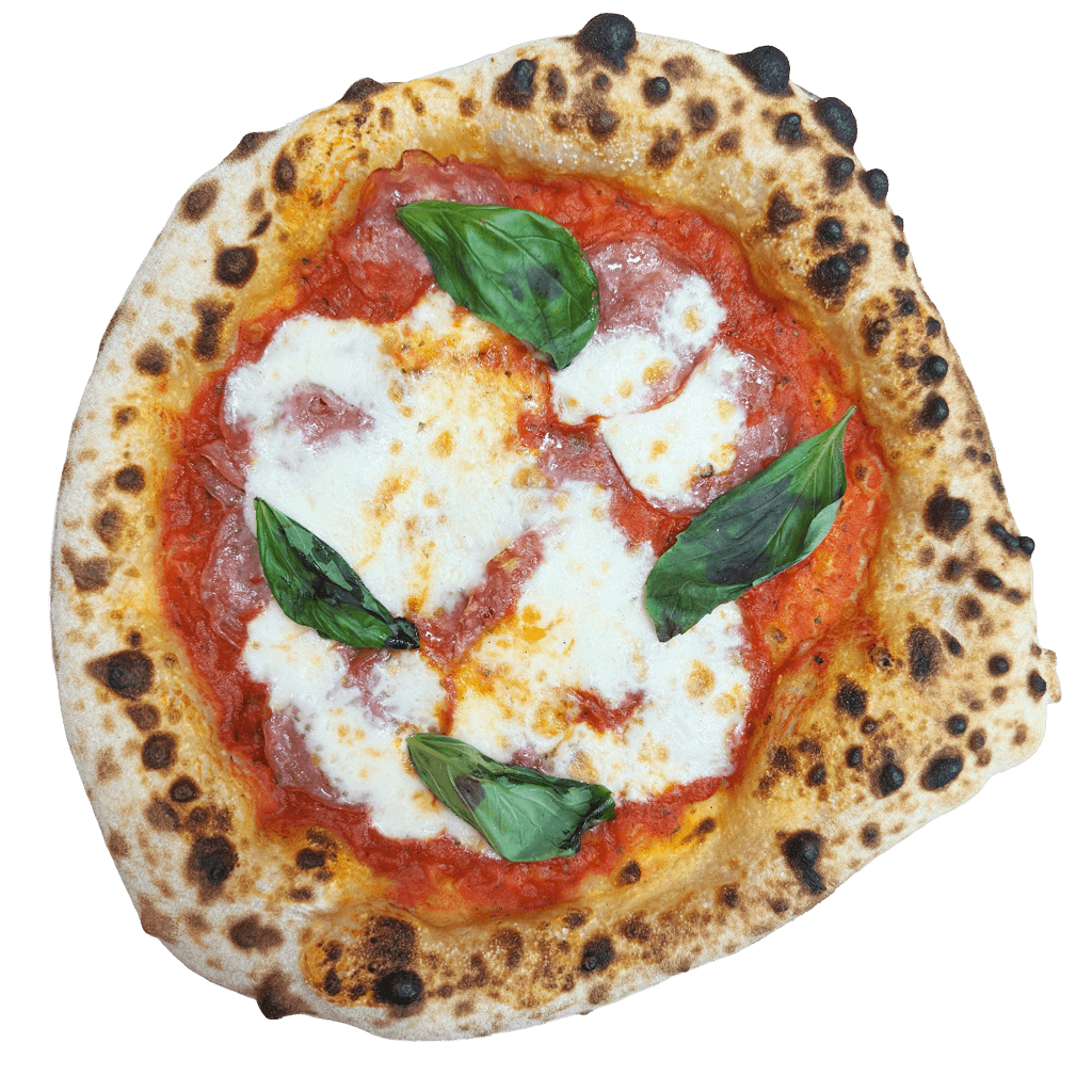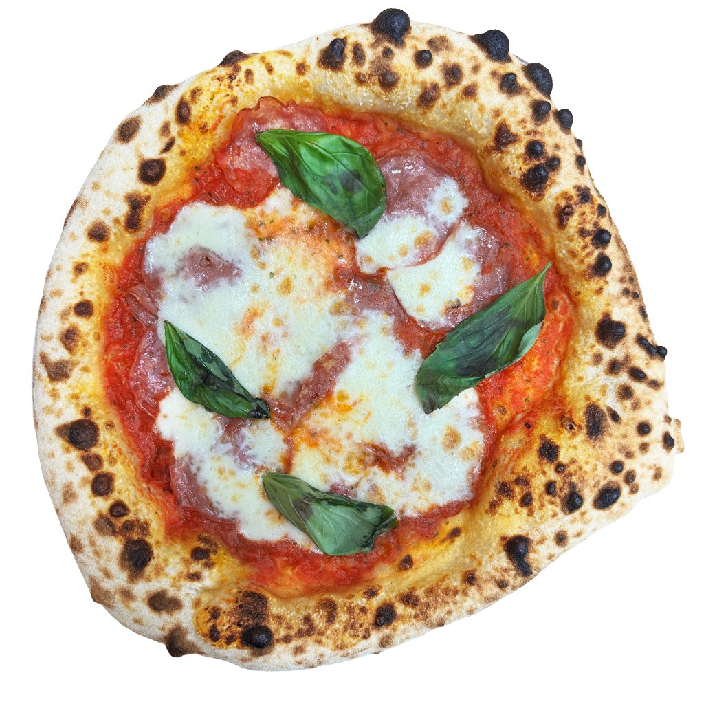 Mit Salami Napoli, San-Marzano-Tomatensoße aus sonnengereiften Tomaten, Fior di Latte, verfeinert mit kaltgepresstem Olivenöl und frischem Basilikum