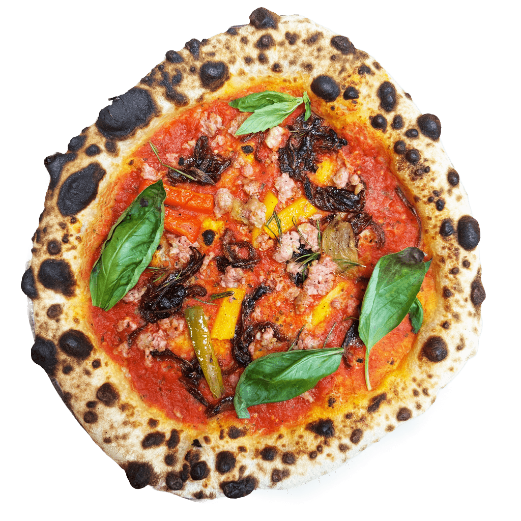 Mit San-Marzano-Tomatensoße aus sonnengereiften Tomaten, Fior di Latte und Mozzarella, belegt mit italienischer Salsiccia, karamellisierten roten Zwiebeln, gegrillten marinierten Paprika und aromatischem Rosmarin, verfeinert mit kaltgepresstem Olivenöl und frischem Basilikum.