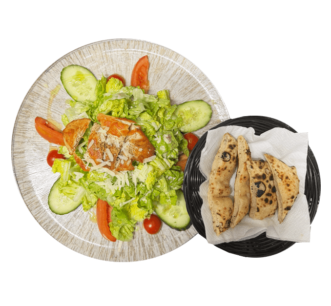 Frischer Römersalat mit saftigem Hähnchen, Kirschtomaten und Gurken, verfeinert mit feinem Parmesan und klassischem Caesar-Dressing, serviert mit warmem Brot.