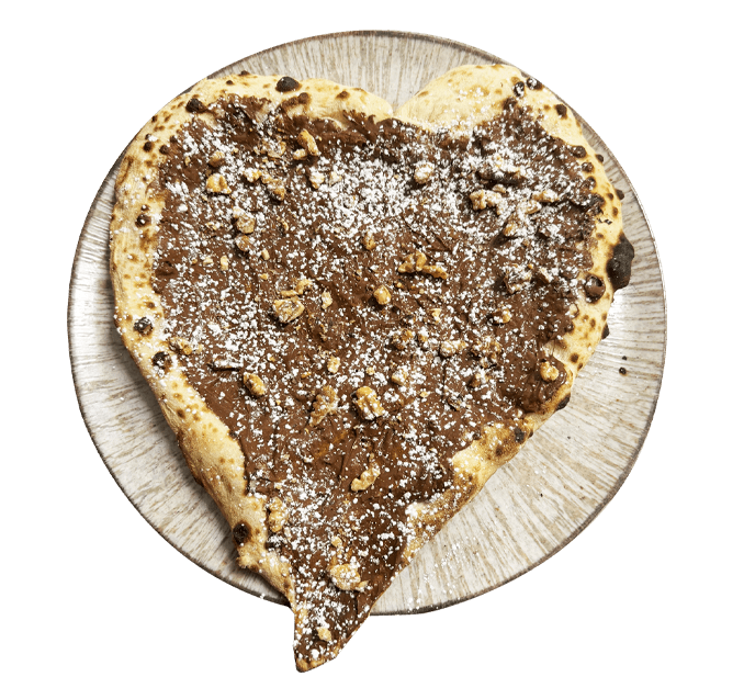 Luftiger neapolitanischer Pizzateig mit seinem charakteristischen dicken, weichen Rand (Cornicione), gefüllt mit Nutella und gerösteten Walnüssen, in Herzform gebacken.