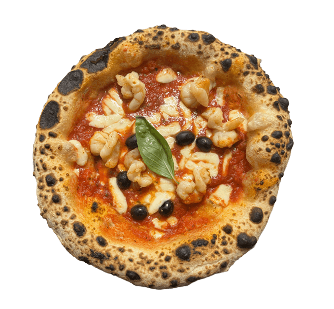 Mit San-Marzano-Tomatensoße aus sonnengereiften Tomaten, Fior di Latte, Garnelen und schwarzen Oliven, verfeinert mit Knoblauchöl und frischem Basilikum.