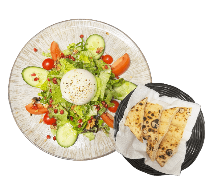 Gemischter Salat mit Kirschtomaten, Gurken, Granatapfel, Rucola und Walnüssen, verfeinert mit Pesto-Dressing. Dazu Burrata, beträufelt mit kaltgepresstem Olivenöl, schwarzem Pfeffer und frischem Brot.