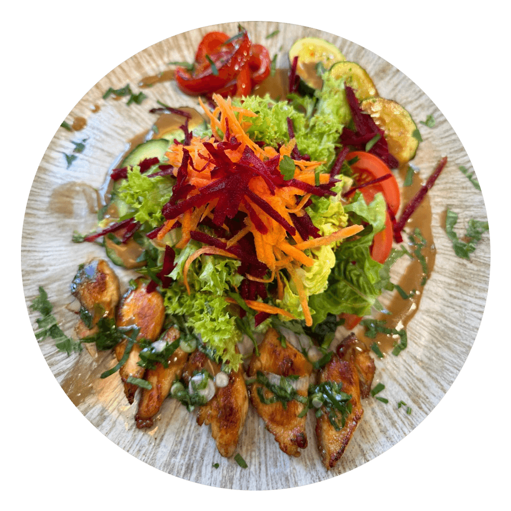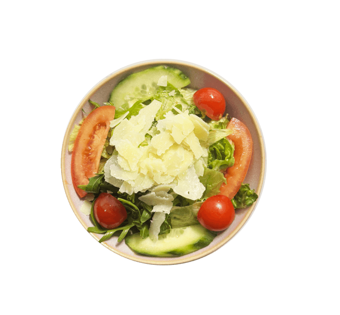 Frischer gemischter Blattsalat mit knackigen Gurken und süßen Kirschtomaten, verfeinert mit einem aromatischen Balsamico-Dressing. Dazu knusprig gebratener Baconspeck und cremige Burrata. Abgerundet mit kaltgepresstem Olivenöl und frisch gemahlenem Pfeffer.