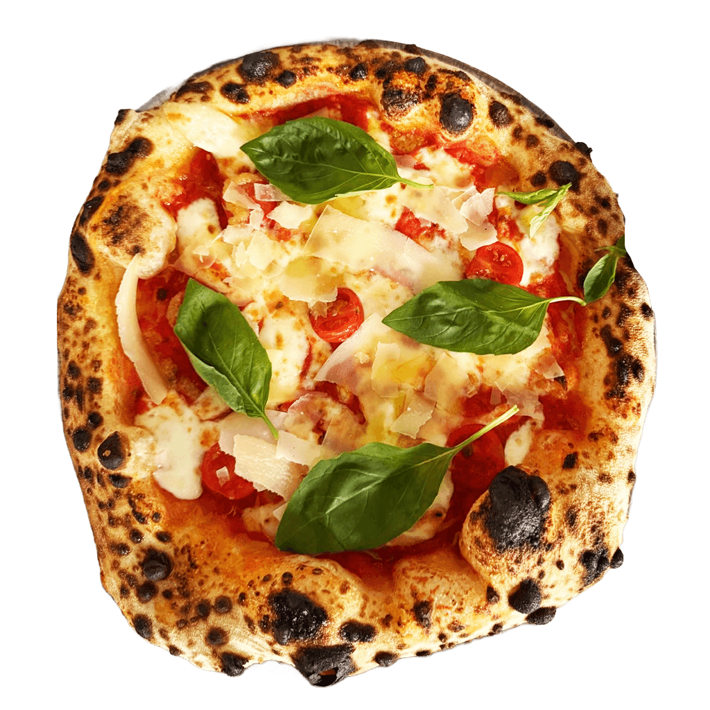 Margherita mit San-Marzano-Tomatensoße aus sonnengereiften Tomaten, Fior di Latte, feinem Parmigiano Reggiano und Kirschtomaten, verfeinert mit kaltgepresstem Olivenöl und frischem Basilikum.