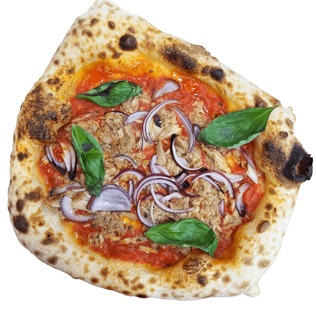 Mit San-Marzano-Tomatensoße aus sonnengereiften Tomaten, Fior di Latte, Thunfisch und roten Zwiebeln, abgeschmeckt mit frisch gemahlenem schwarzem Pfeffer, verfeinert mit kaltgepresstem Olivenöl und frischem Basilikum.