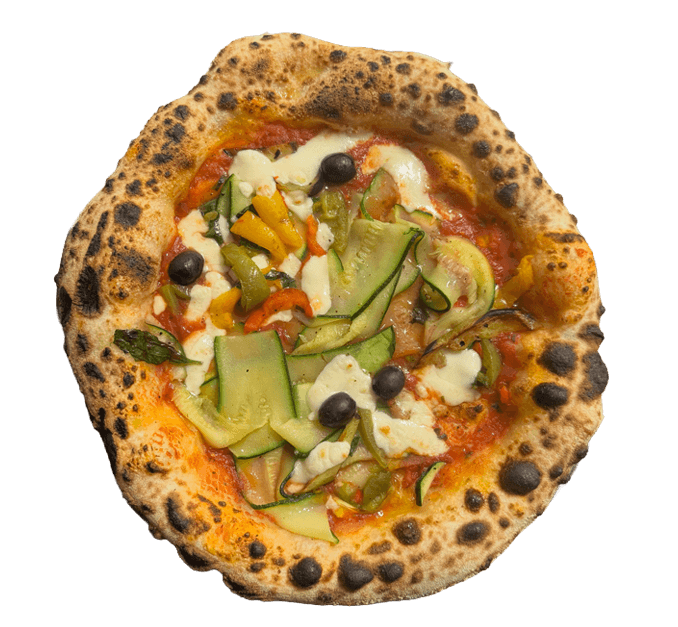 mit San-Marzano-Tomatensoße aus sonnengereiften Tomaten, Fior di Latte, gegrillten Auberginen, marinierten Zucchini, marinierten Paprika und schwarzen Oliven, verfeinert mit kaltgepresstem Olivenöl und frischem Basilikum.
