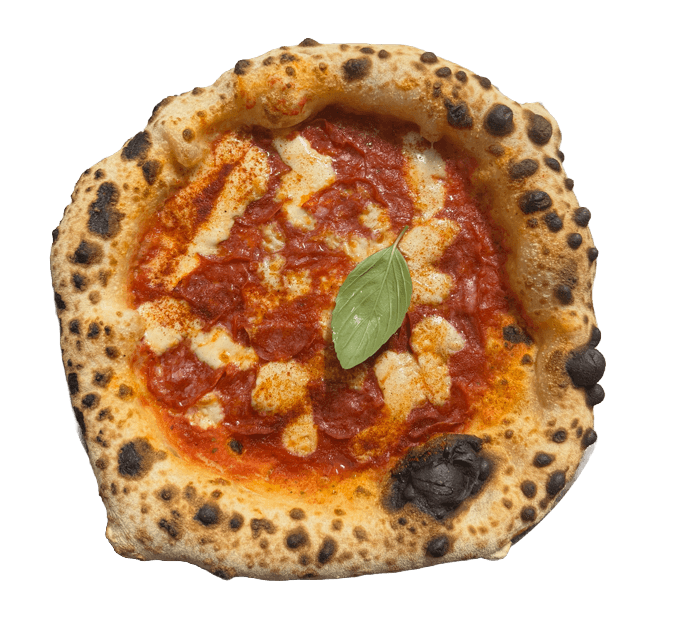 Ein beliebter, scharfer Klassiker: Mit San-Marzano-Tomatensoße aus sonnengereiften Tomaten, Fior di Latte, scharfer Salami und Paprikapulver, verfeinert mit scharfem Honig.